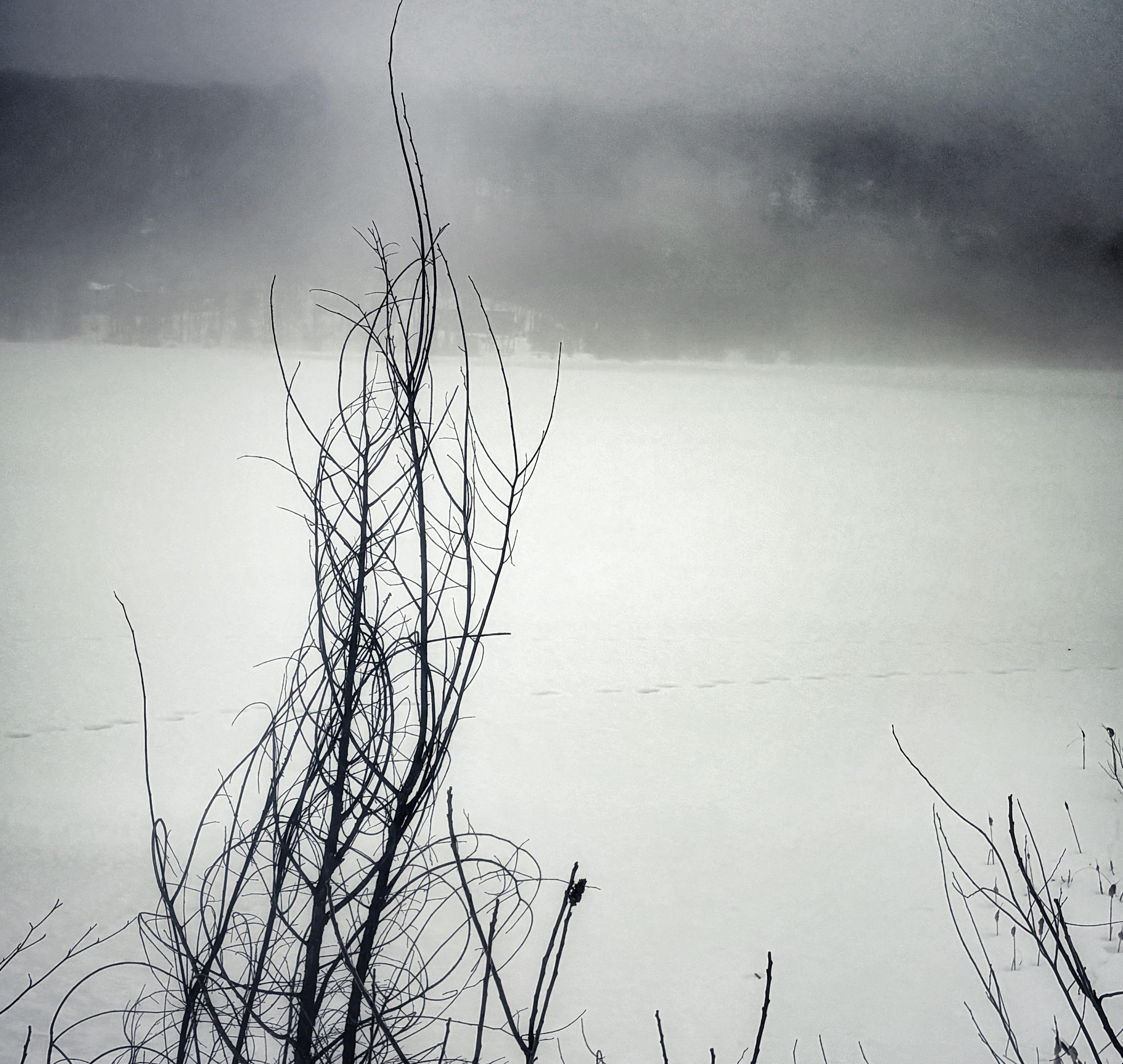 This morning I play a game of hopscotch to get down from my treehouse to the parking lot. Ice lingers on the steps, grey-white as mist after a rain.
