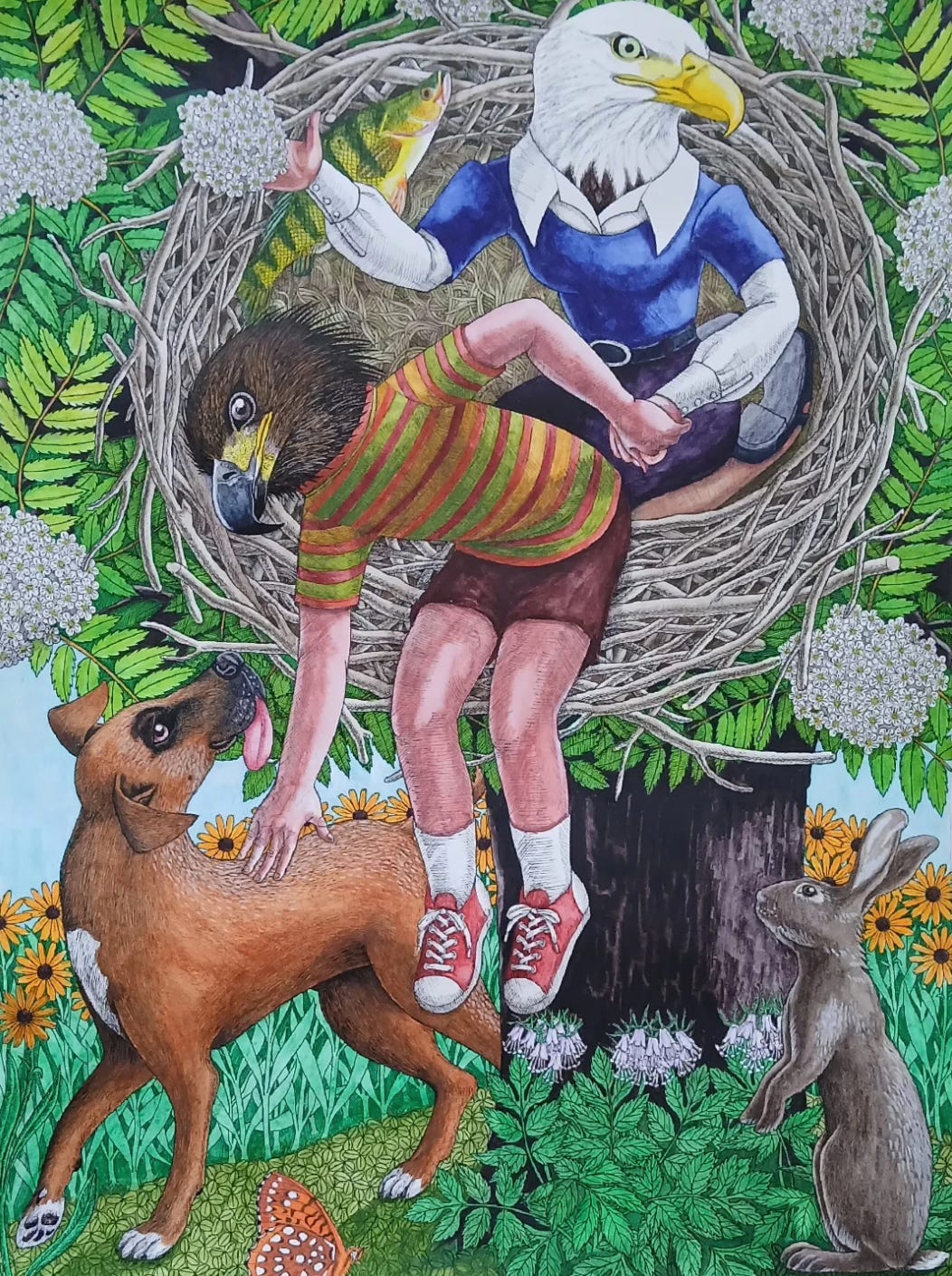 Fledgling, Ink, watercolour, gouache on cotton rag paper, 15" x 20”, 2025.