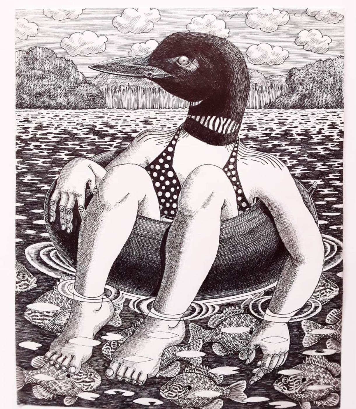 Floating Loon, ink on paper, 9"x12"