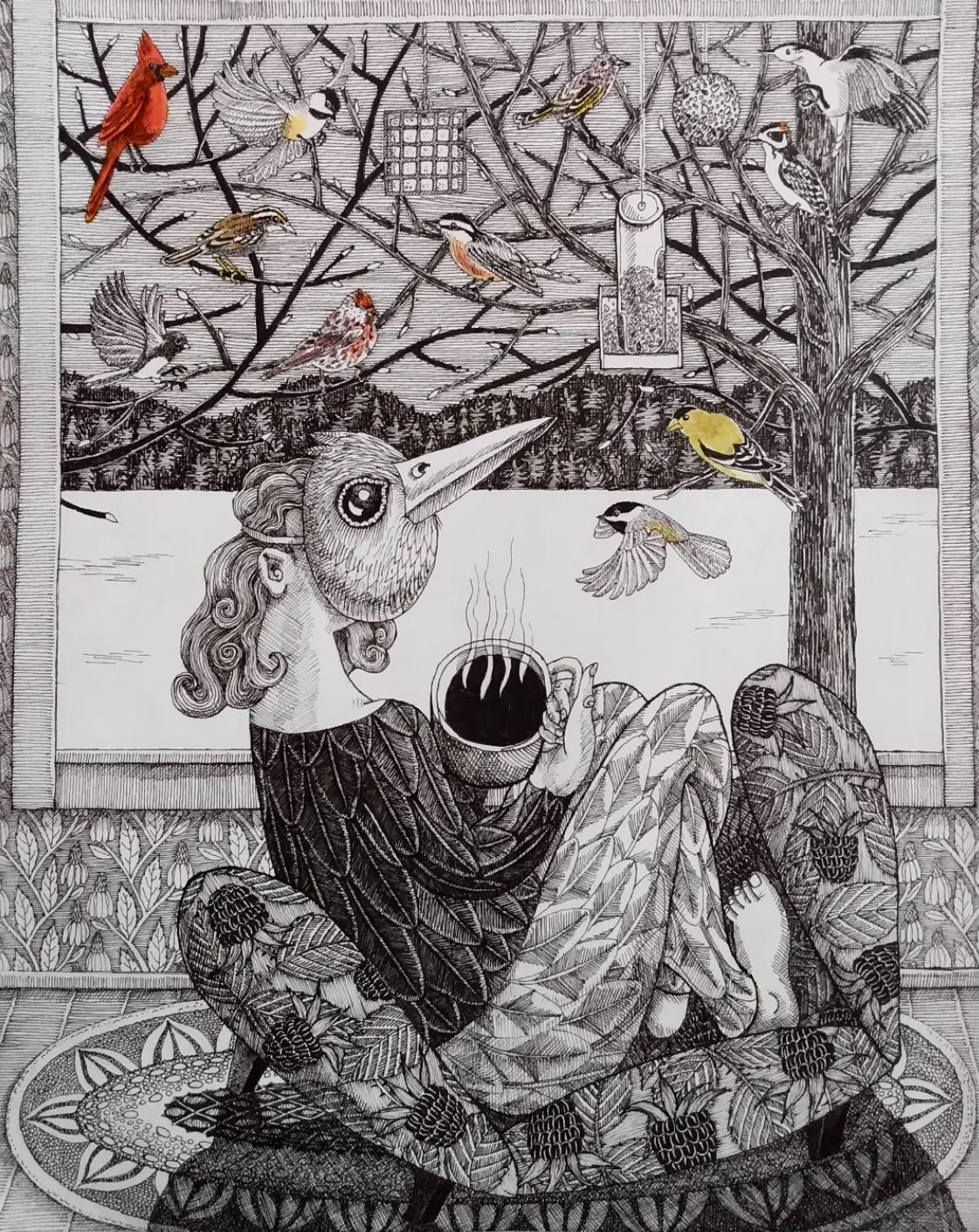 Winter Birds, ink on paper, 9" x 12", 2023.